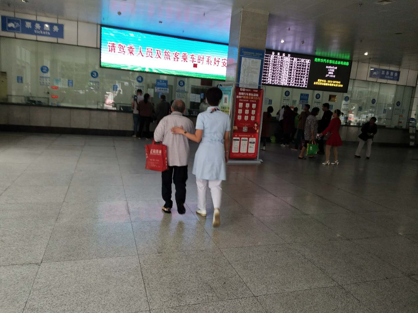 总服务台工作人员见老爷爷独自一人,便将老爷爷送至绵阳汽车总站,并帮助其买好车票,送上汽车。