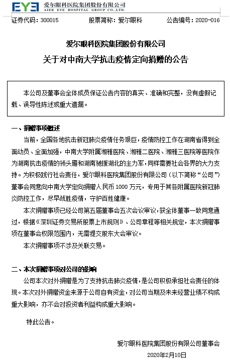 爱尔眼科增援抗疫主力军捐赠1000万元支持中南大学附属医院