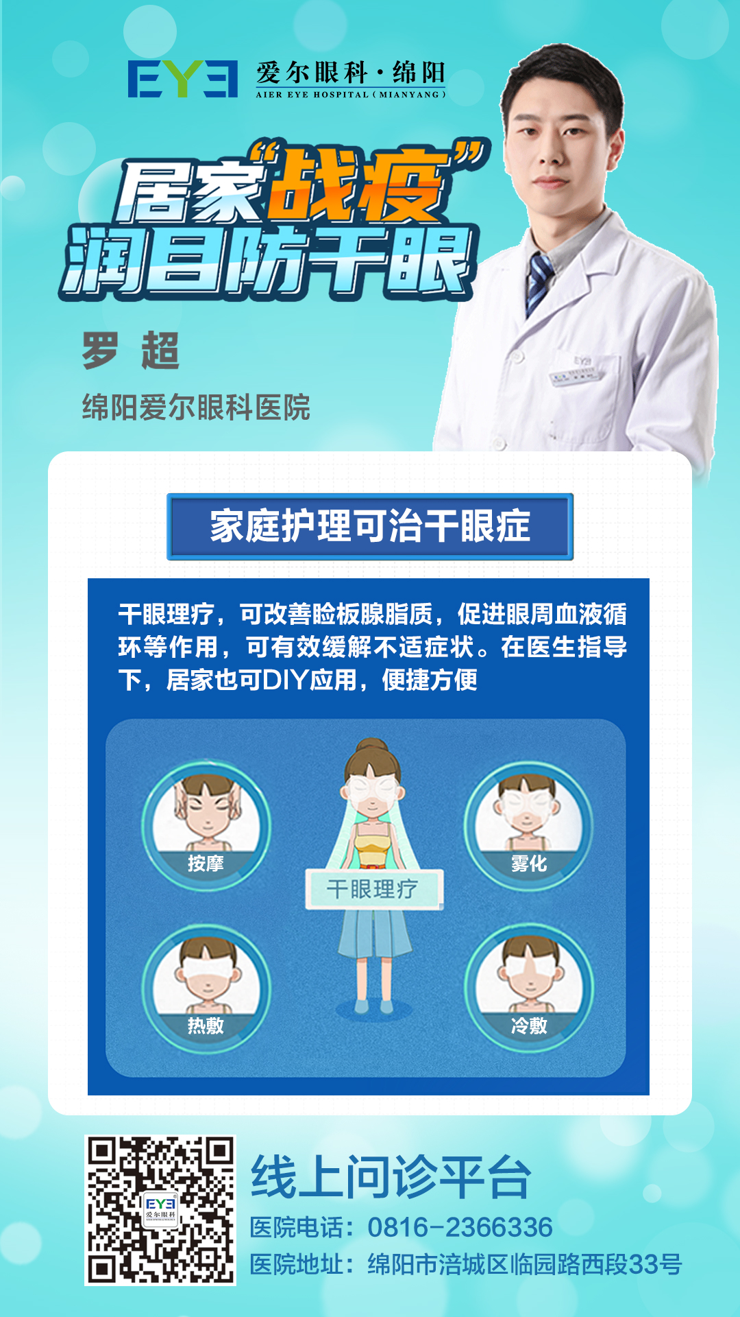 家庭护理可治干眼症 发布日期2020-03-01爱尔眼科 #共同战疫# 居家“战疫” 润目防干眼 润目防干眼 ???? 家庭护理可治干眼症 微信扫一扫 关注爱尔眼科官方微信! 爱眼护眼早知道,还可直接咨询医生
